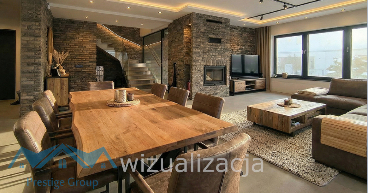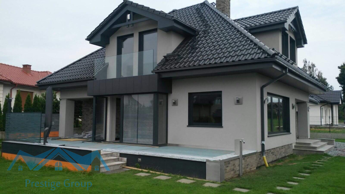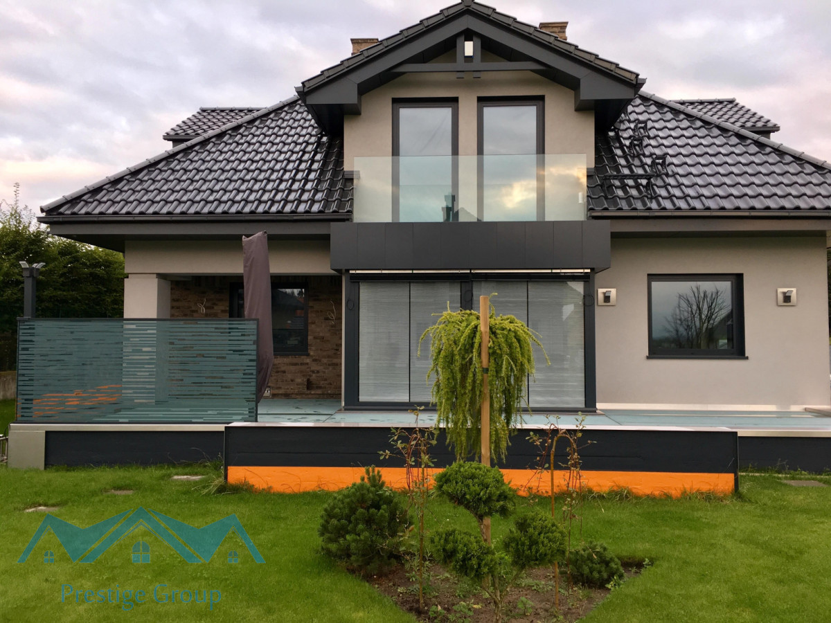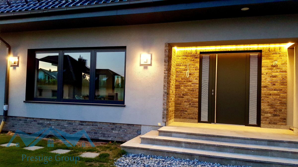 Parterowy dom z poddaszem użytkowe wyróżnia się przemyślanym rozkładem i nowoczesną bryłą, a jego wysoką klasę podkreślają szlachetne detale , takie jak schody oraz wiatrochłap wykończone naturalnym kamieniem i szkłem.