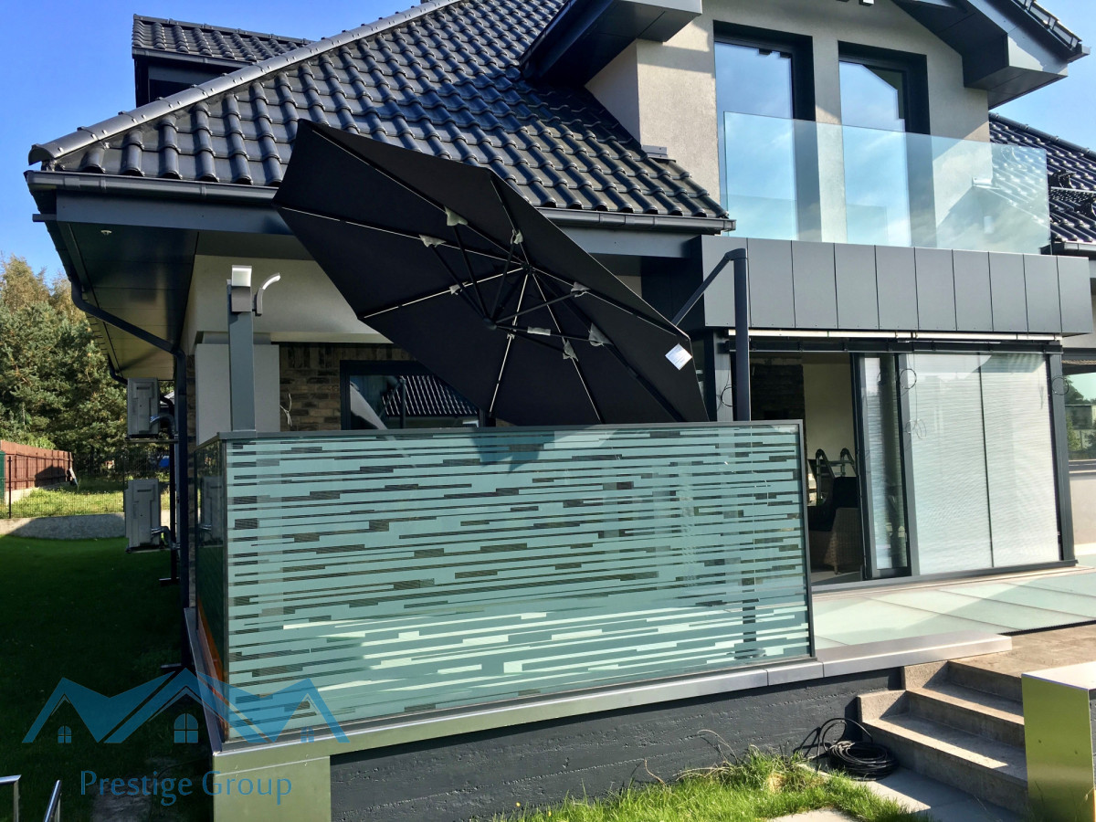 W strefie dziennej zastosowano wielkoformatowe okno tarasowe z innowacyjnymi lamelami przeciwsłonecznymi ukrytymi wewnątrz szyb. Takie rozwiązanie pozwala cieszyć się jasnym wnętrzem bez dostępu promieni słonecznych .