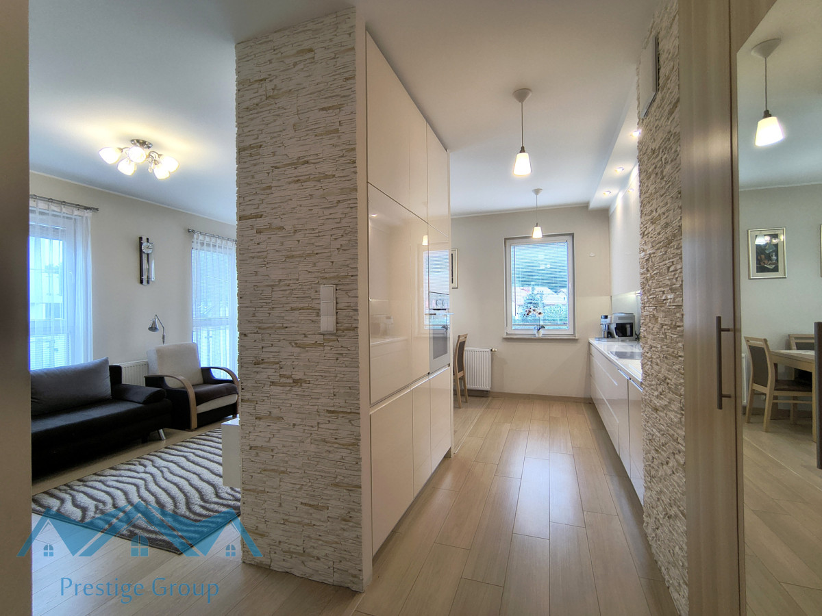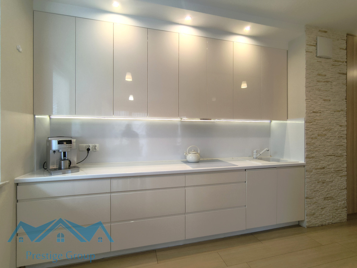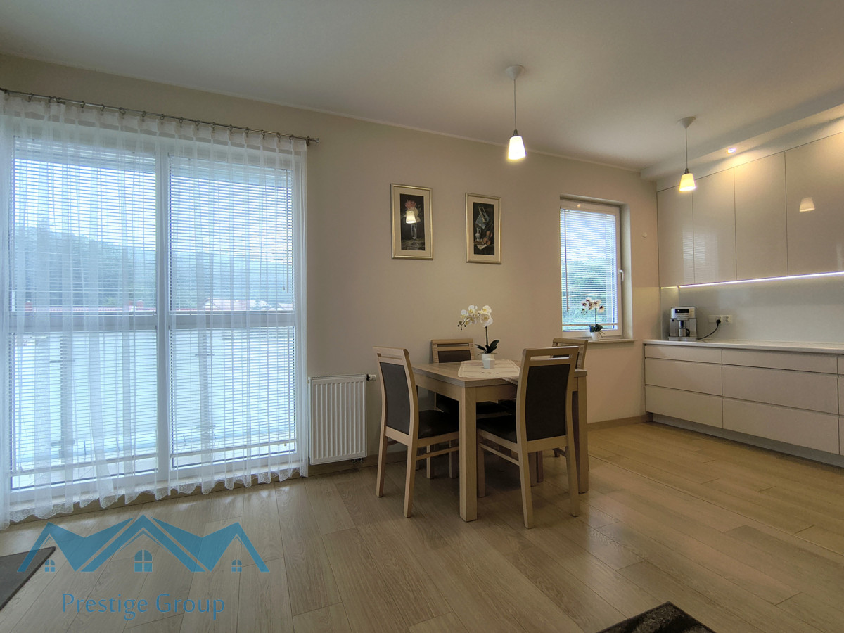 Aneks kuchenny z jasną kolorystyką i lakierowanymi frontami szafek, zarówno górnych, jak i dolnych, które w połączeniu z białymi blatami tworzą harmonijną i nowoczesną przestrzeń. Kuchnia jest w pełni wyposażona w sprzęt AGD renomowanych marek: lodówkę Bosch (zabudowaną), piekarnik Amica oraz zmywarkę Bosch (również zabudowaną). Dodatkowe oświetlenie LED nad blatem roboczym podkreśla minimalistyczny design i funkcjonalność. Tuż obok znajduje się część jadalniana z solidnym drewnianym stołem i czterema wygodnymi krzesłami.