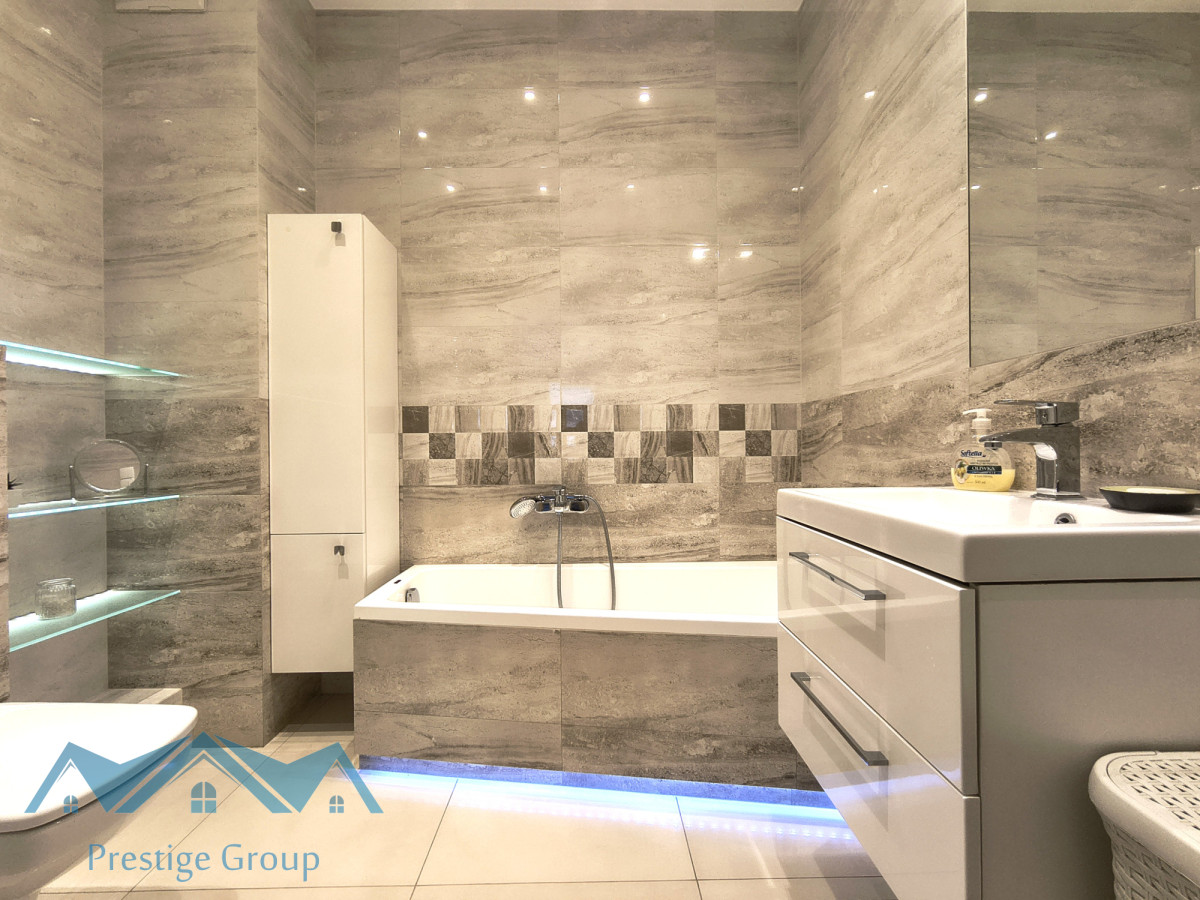 Funkcjonalność mieszkania podkreśla przestronna łazienka, wykończona eleganckimi płytkami w odcieniach szarości, imitującymi naturalny kamień.